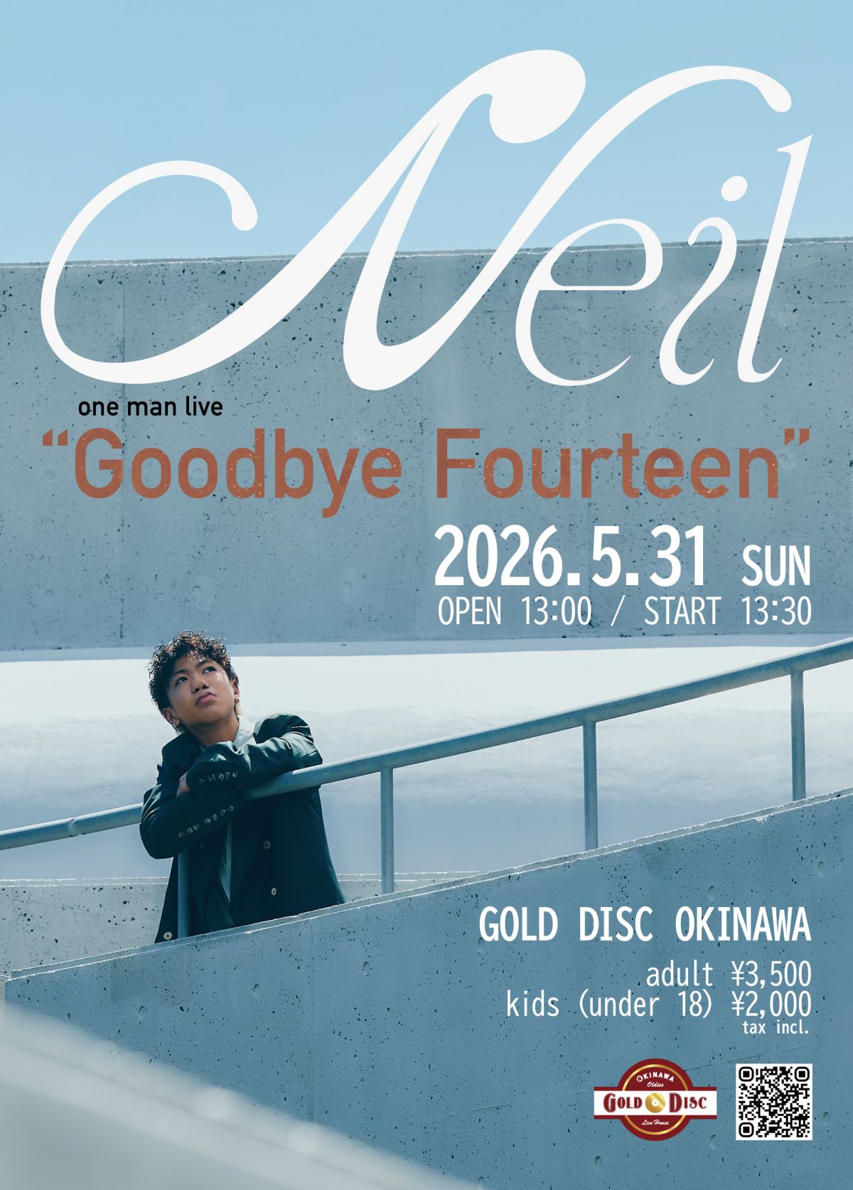 5月31日 (日)に沖縄県・那覇市のGOLD DISC OKINAWAにて初のバックバンドスタイルでのワンマンライブ開催!!タイトルは『Goodbye Fourteen』。6月に15歳の誕生日を迎えるNeilの”14歳ラストライブ”となるとのこと。子供と大人のちょうど真ん中あたり、14歳最後の歌声をぜひ聴きに来てほしい。